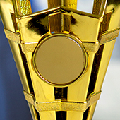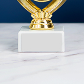 Навершие кубка выполнено из прочного ABS-пластика с эффектным золотым напылением. Оно красиво отражает свет, выглядит торжественно и сохраняет презентабельный внешний вид. Основание изготовлено из прессованного белого мрамора — материал придаёт изделию устойчивость, вес и ощущение статуса.